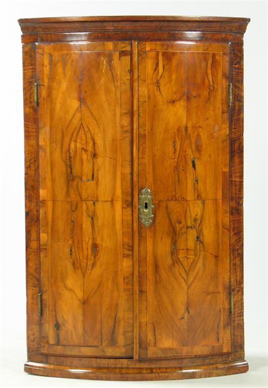 A walnut bowfront hanging corner cupboard, the moulded cornice above shelves and a spice drawer, enclosed by a pair of quarter veneered doors, with stringing and banding, to a base moulding, 18th century and later, 36in (91.4cm) h, 23.25in (59cm) w, 15in 938cm) d.