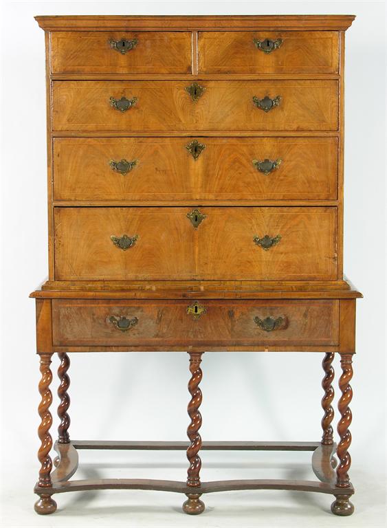 A walnut veneered chest on stand, the moulded ogee cornice above two short and three long banded drawers fitted brass plate handles, the stand with a frieze drawer, on spiral twist supports united by shaped peripheral stretchers, on bun feet, 18th century and later, 61in (155cm) h, 40.5in (103cm) w, 23in (58.5cm) d.