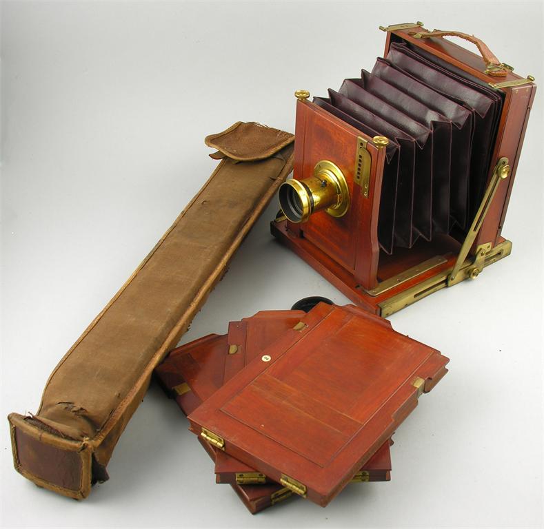 A mahogany and brass mounted plate camera, inset an ivory disc 'TALBOT & EAMER * BLACKBURN,' the lens with aperture adjuster, with three plate holders and folding stand.