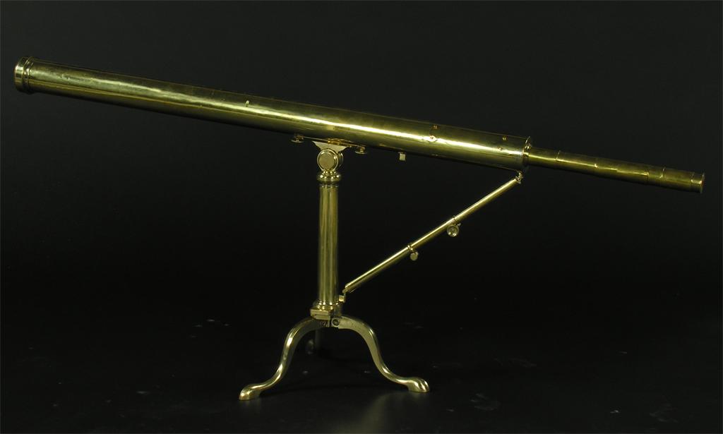 Dollond, London. An early 19th century brass telescope, the 3in dial body with an adjusting eye piece, on turned barrel stem to folding cabriole legs, 22in (56cm) h, 54.5in (138.5cm) l.