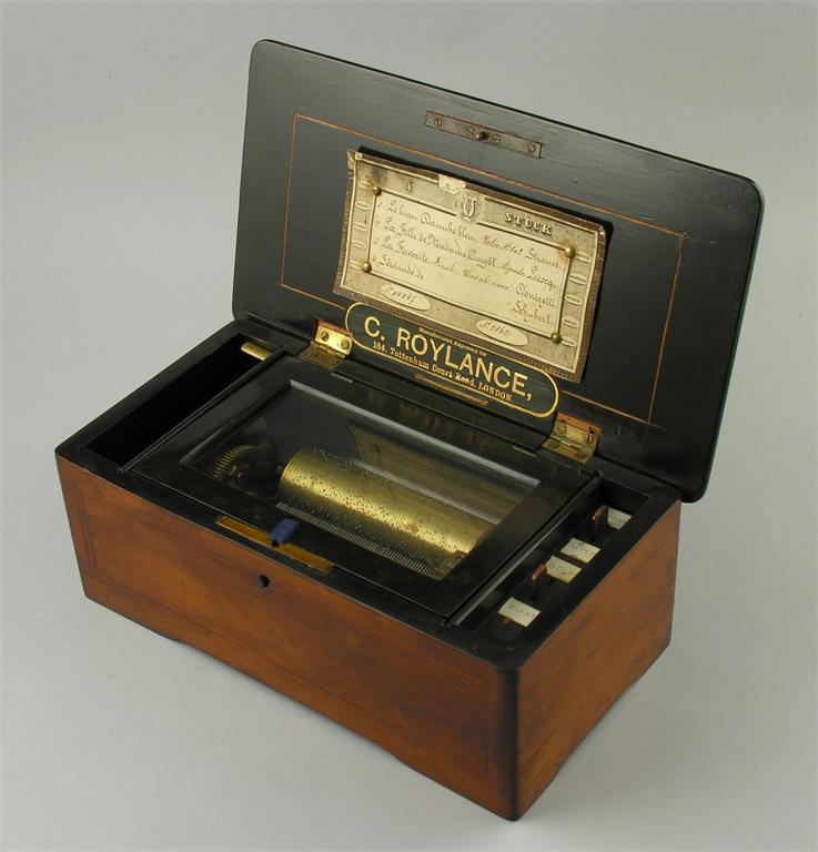 A Swiss musical box, stamped 'A P Co,' playing 4 airs, No. 44067 and No. 2162, with a crack wind 5in (12.5cm) barrel, the hinged cover with tune sheet and printed label 'C.ROYLANCE, 184. Tottenham Court Road. LONDON,' to a rosewood and marquetry inlaid top, 4.75in (12cm) w, 12.5in (31.7cm) w, 7in (17.7cm) d. One tooth missing.