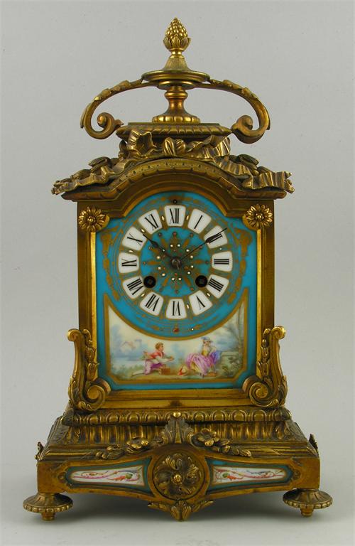 A late 19th century French gilt brass and porcelain mounted mantel clock, the 8 day movement stamped 'Japy Freres' and 'LB with anchor' to an arched blue ground dial decorated a romantic scene, the floral decorated case with an urn surmount, 14.25in (36cm) h.
