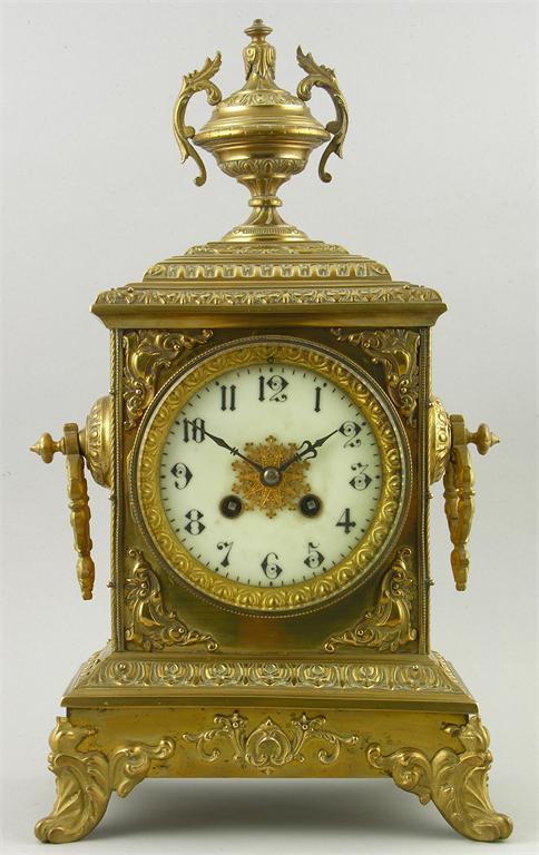 A late 19th century French brass mantel clock, the 8 day movement stamped 'Japy Freres,' and striking on a gong, to a circular dial, 15.5in (39.4cm) h.