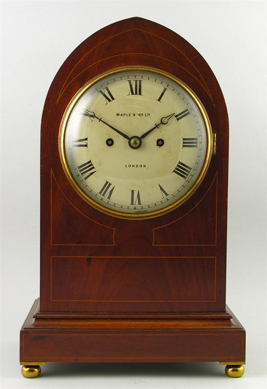 A late Victorian mahogany lancet shape bracket clock, the twin fusee movement striking on a gong, to a painted dial inscribed 'MAPLE & Co LTD, LONDON,' the front inlaid stringing to pierced scale brass panel sides, 17.5in (44.5cm) h, 11in (28cm) w.