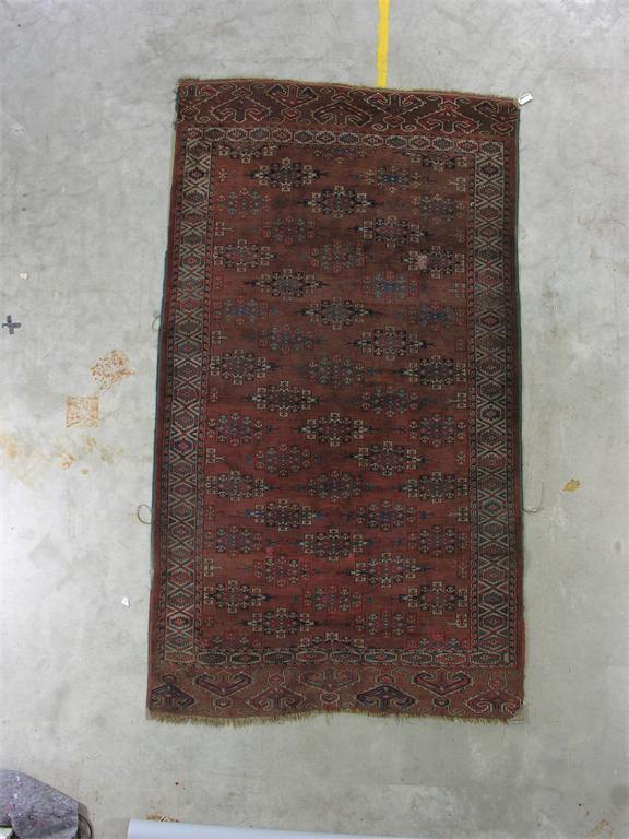 A Yomut main carpet with kepse guls, mid 19th century, 118 x 65.5in (299.5 x 166cm). Repairs and wear to ends.