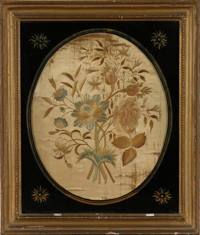 A 19th century oval floral needlework panel