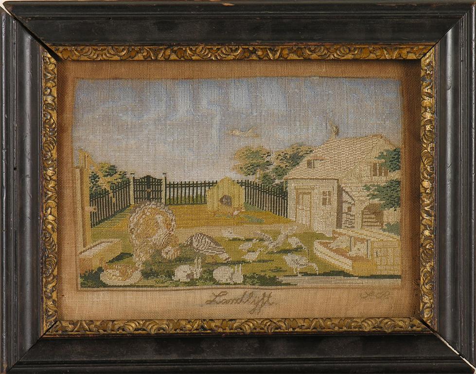 A European needlework picture, 'Landlyft' signed with initials 'J.R' worked in tent stitch with painted sky, 5 x 7in (12.6 x 17.8cm).