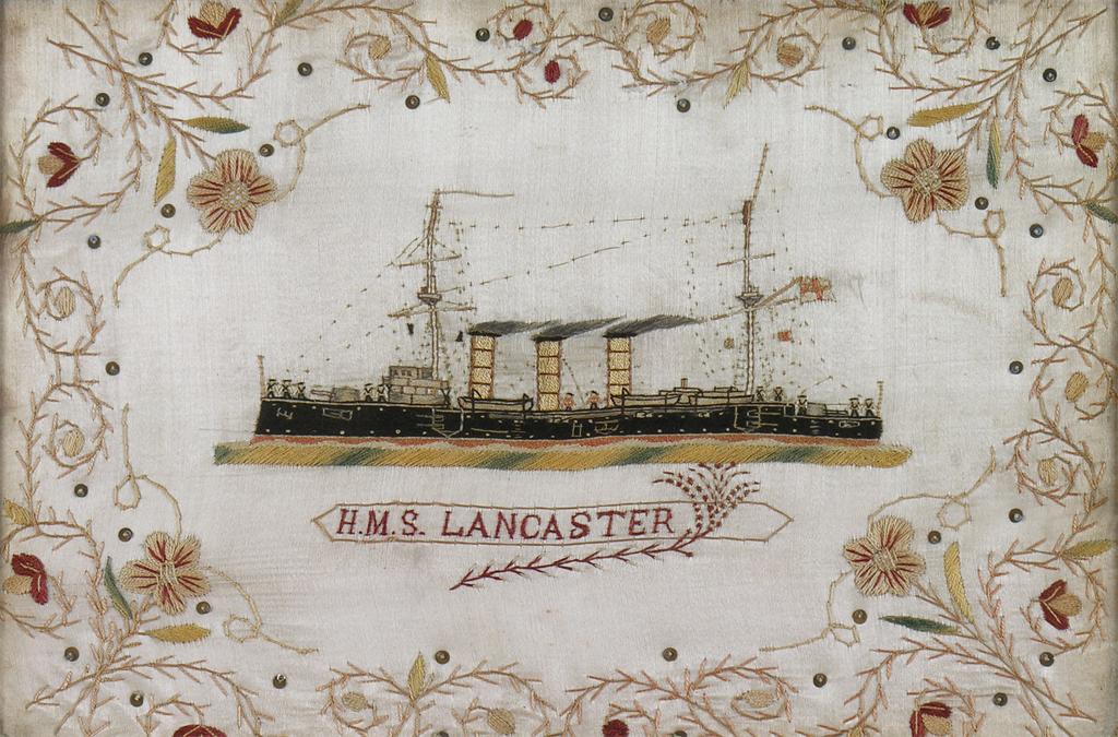 A needlework picture on silk, 'H.M.S. Lancaster', 12 x 17.5in (30.5 x 44.5cm).