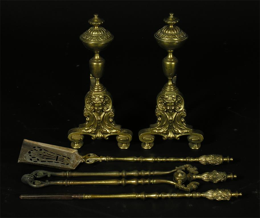 A pair of gilt brass andirons, 16.75in (42.5cm) h, 8in (20.2cm) w, and a set of three late Victorian brass fire irons. (5)