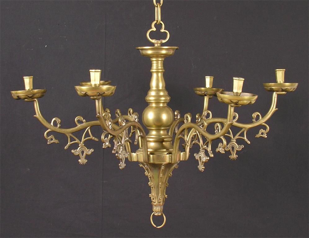A brass six light chandelier in the Gothic taste, the turned stem to scroll branches with open stylized decoration to lobed drip pans and faceted holders, the crocketed tapering base with an animal head terminal with a ring, 26in (66cm) h, 34.5in (87.5cm) w.