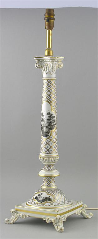 A modern German porcelain table tamp, with painted river landscape vignettes, 25in (63.5cm) h.