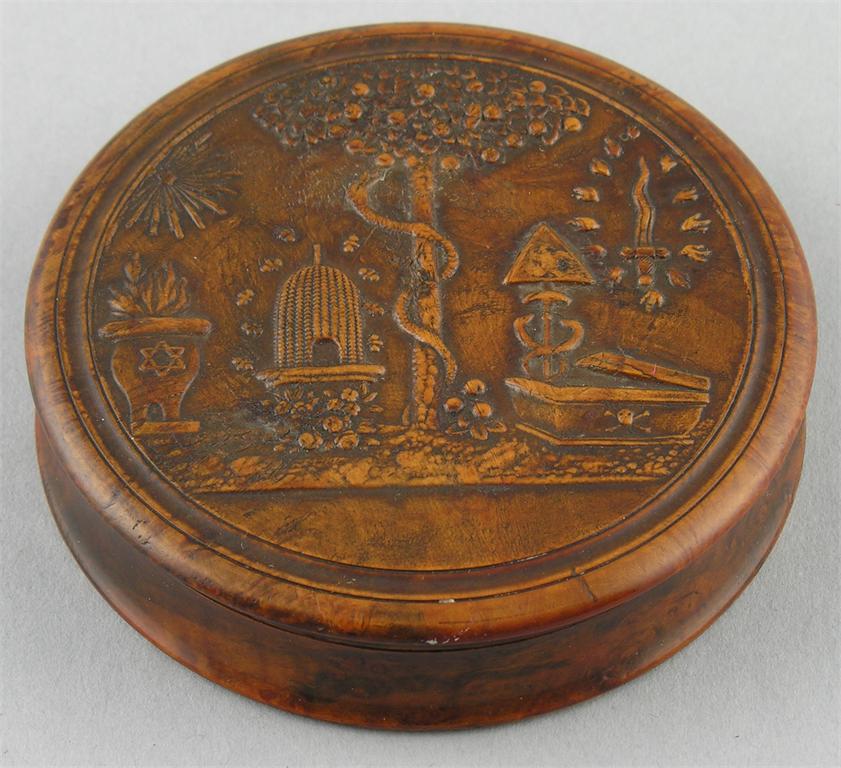 An early 19th century French circular walnut snuff box, the 'pressed' cover depicting Masonic symbols, the interior tortoiseshell lined, 3.25in (8.3cm) d. See Evan-Thomas, Owen. Domestic Utensils of Wood. Plate 41 for a similar example.