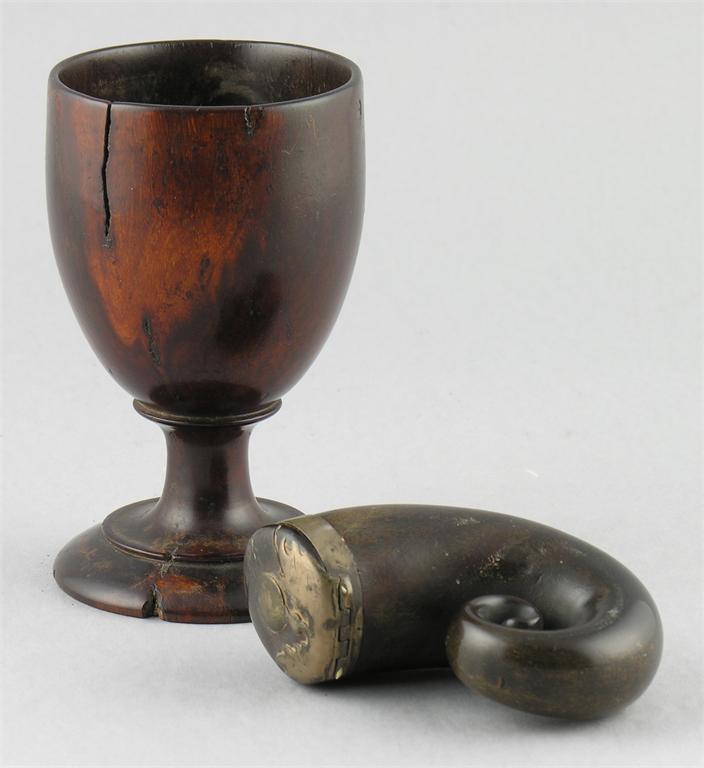 An early 19th century turned lignum vitae stem goblet, 5in (12.7cm) h, and a 19th century Scottish horn snuff mull. (2)