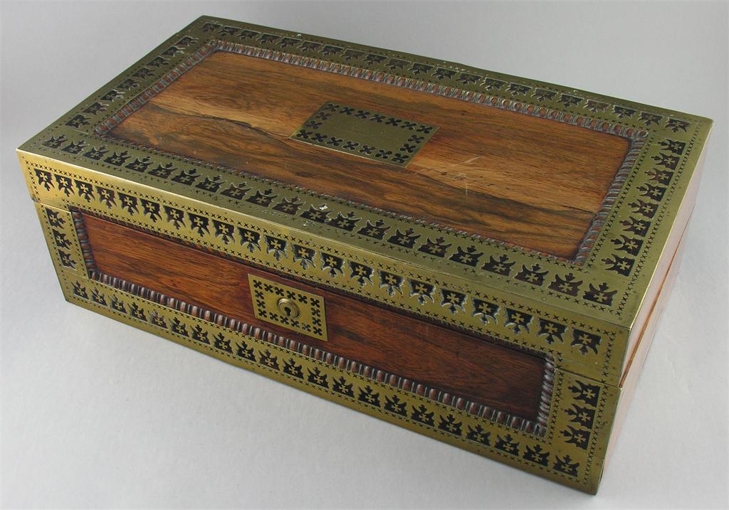 A George IV Scottish rosewood and cut brass writing slope, by Wilson & Co, Edinburgh, the cover inset a plaque inscribed 'Euphemia Erskine', the fitted interior with paper trade label 'Wilson & Co,...71 George Street, Edinburgh...', the lock stamped 'GR (crowned) Patent' four times, a side frieze drawer, 6.5in (16.5cm) h, 19.75in (50cm) w, 10.75in (27.3cm) d.