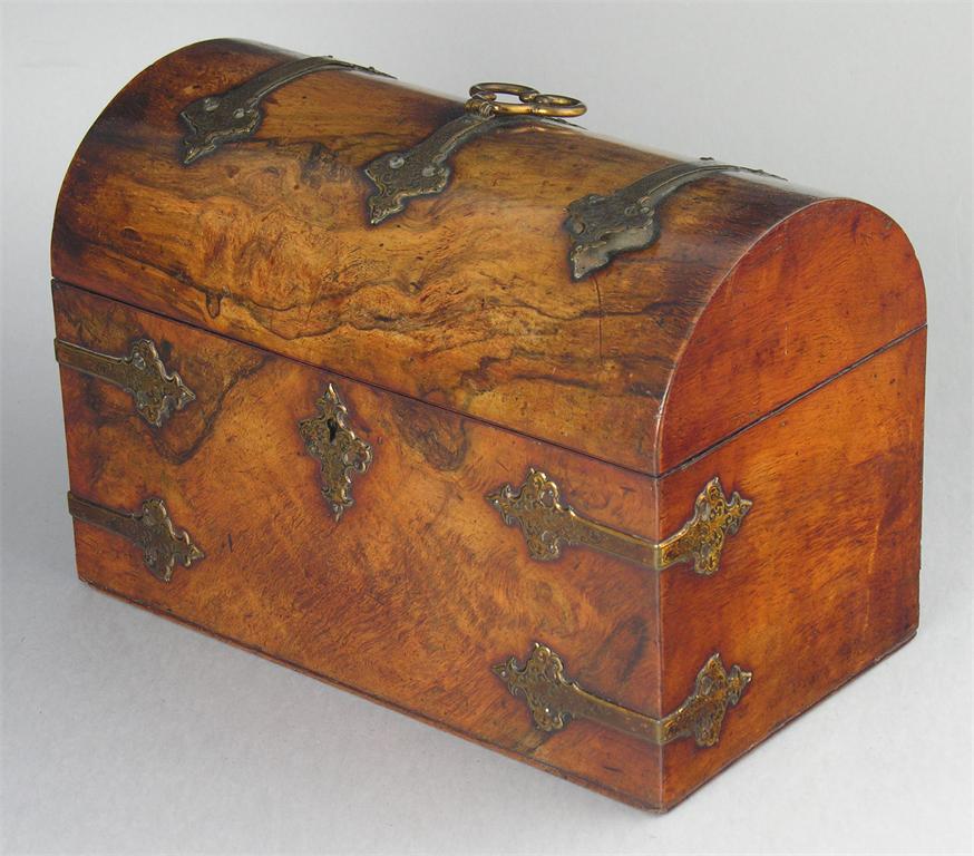 A Victorian walnut and engraved brass mounted tea caddy
