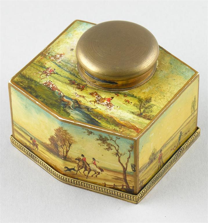 A continental painted wood and brass mounted ink well, decorated hunting scenes, the reserve signed 'Dreyfous', 2.75in (7cm) h, 3.5in (9cm) w.