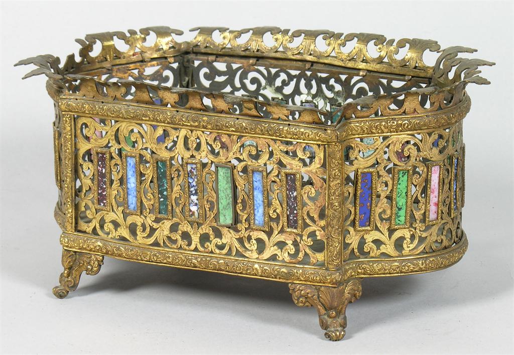 An early 19th century engraved, chased and pierced gilt brass oblong jardiniere, mounted Venetian glass panels, 5.5in (14cm) h, 12.5in (31.8cm) w, 8in (20.2cm) d.