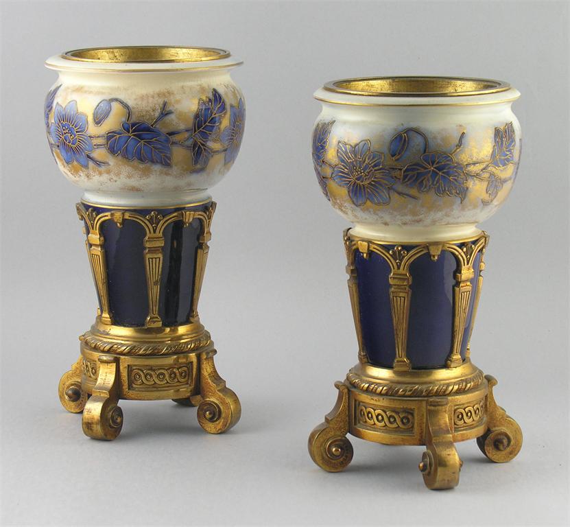 Two brass and ceramic mounted urns