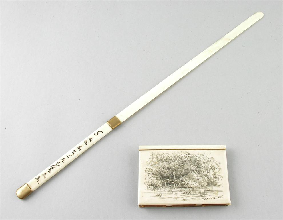 A Victorian ivory and brass mounted letter opener, engraved 'Sandringham Christmas 1877,' 17.25in (437cm) l, and an ivory hinged card case, engraved a river scene 'Clieveden'. (2)