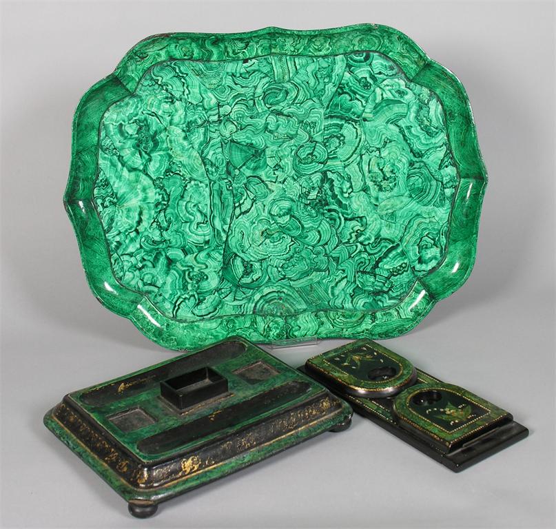 A papier-mache 'malachite' decorated tray, stamped 'JENNENS & BETTRIDGES MAKER LONDON,' 25in (63.5cm) w, an adjustable book stand and a desk stand, missing wells and cover. (3)