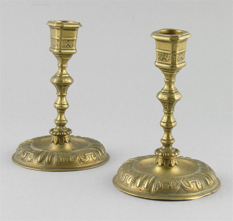 A pair of 18th century style brass candlesticks, with engraved and chased decoration, having detachable nozzles, one base stamped 'LR 37' worn, 6.25in (16cm) h. (2)