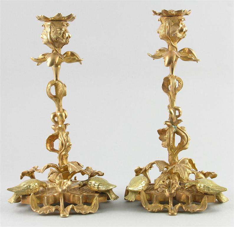 A pair of gilt brass and silvered foliage candlesticks, the triform bases with doves, 11in (28cm) h. (2)