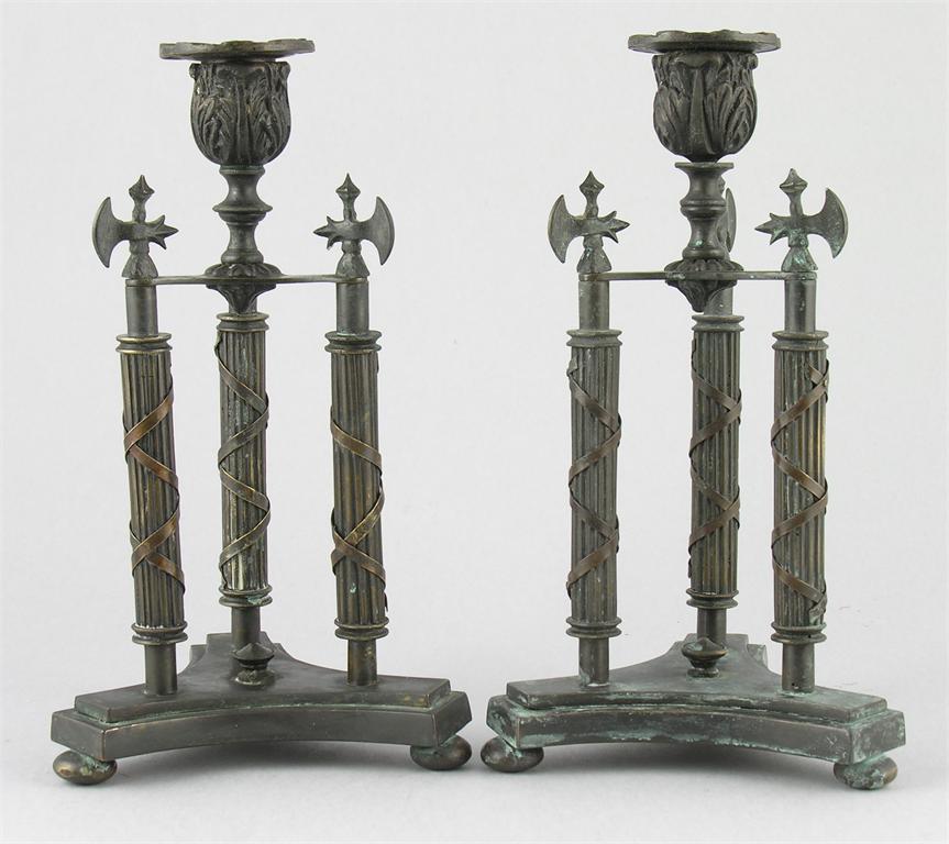 A pair of bronze candlesticks, with fasces supports, 8.75in (22.2cm) h. (2)