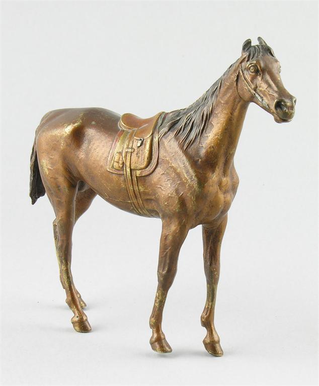A cold painted bronze model of a race horse, early 20th century, 7in (17.8cm) h. Reins missing.