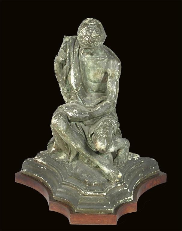 Attributed to Henry Alfred Pegram (1862-1937). A painted plaster figure of a man reading a scroll over his right thigh, 24in (61cm) h, 21in (53.4cm) w, 17.5in (44.4cm) d, on a hardwood plinth. The above figure is a plaster copy of one of the three figures at the base of the bronze candelabra Pegram made for St Paul's Cathedral in 1898.