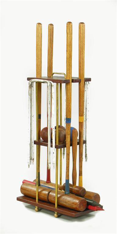 A lawn croquet set, on a hardwood and brass stand.
