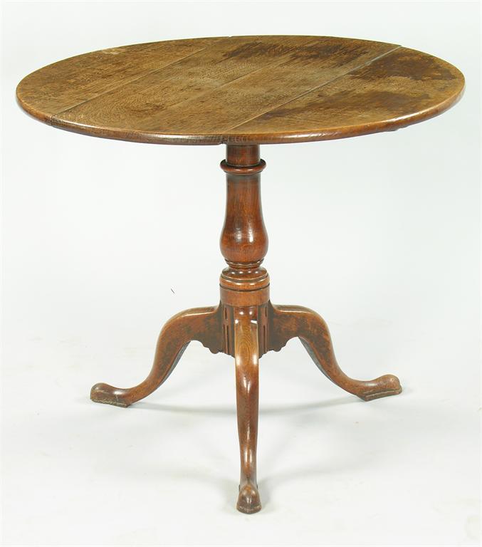 A late George III oak tripod table, the tilt-top to a baluster turned stem and fluted base with shaped moulding, 26.5in (67.3cm) h, 32in (81.2cm) dia.