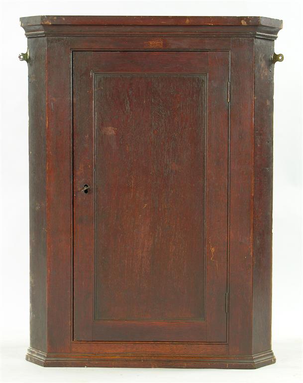 An early 19th century oak hanging corner cupboard, with two shelves, 36in (91.4cm) h, 27.25in (69.2cm) w, 16in (40.6cm) d.