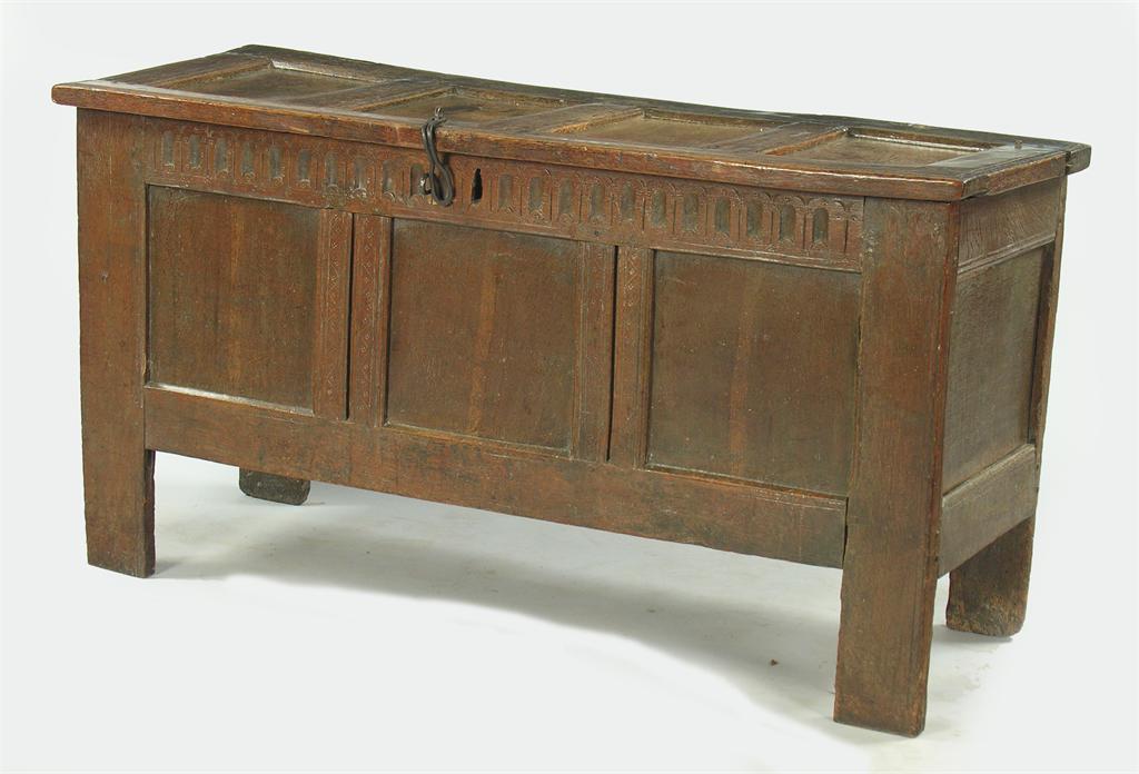 A 17th century oak panelled chest, the quadruple top to a lidded till, the thumb nail frieze above a triple front, 27.5in (70cm) h, 53.5in (136cm) w, 19.25in (48.8cm) d.