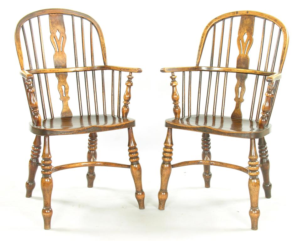 A pair of ash and beech Windsor armchairs, the elm seats stamped 'G.M', the turned legs united by crinoline stretchers. (2)