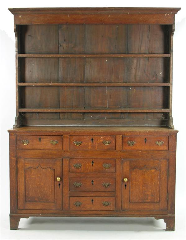 A 19th century oak and pine dresser, the plate rack missing the cup hooks, the base fitted later brass handles, 80.5in (204.4cm) h, 63.25in (160.5cm) w, 19.5in (49.5cm) d.
