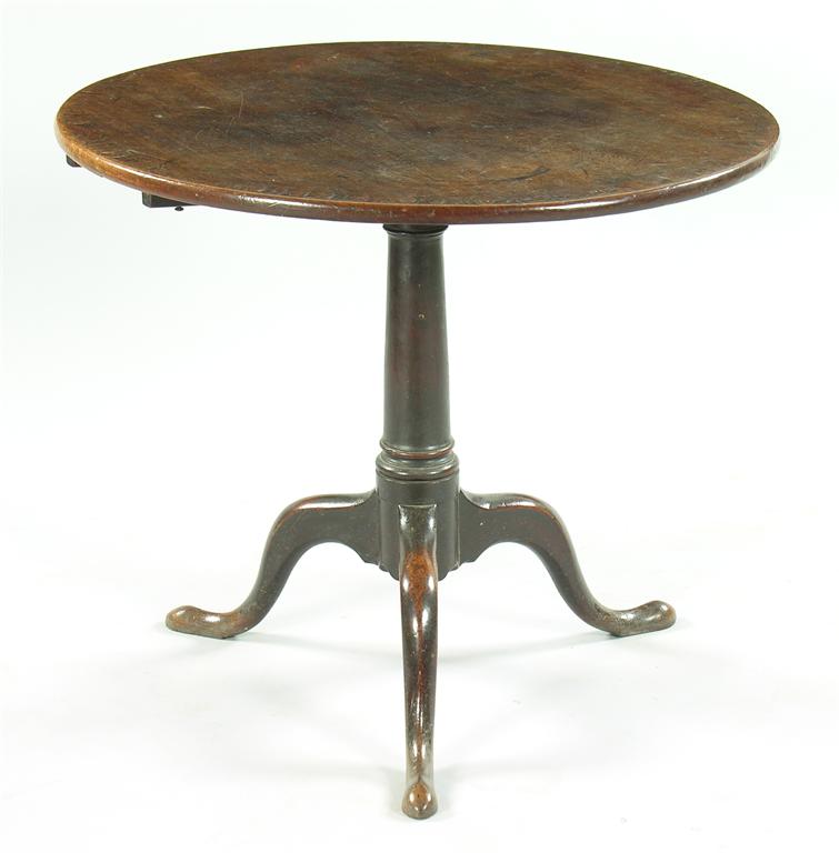 An early 19th century mahogany tripod table, the tilt-top on a barrel turned stem, 25.5in (64.7cm) h, 30in (76cm) dia.