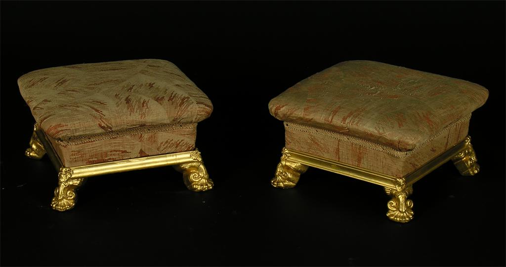 A pair of early 19th century giltwood footstools, with anthemion and scroll feet, 8in (20.3cm) h, 14in (35.5cm) sq.