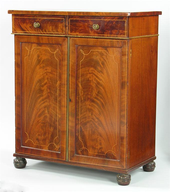 A Victorian mahogany and inlaid strung side cabinet, the interior with two shelves, 36.25in (92cm) h, 30in (76cm) w, 16.25in (41.2cm) d.
