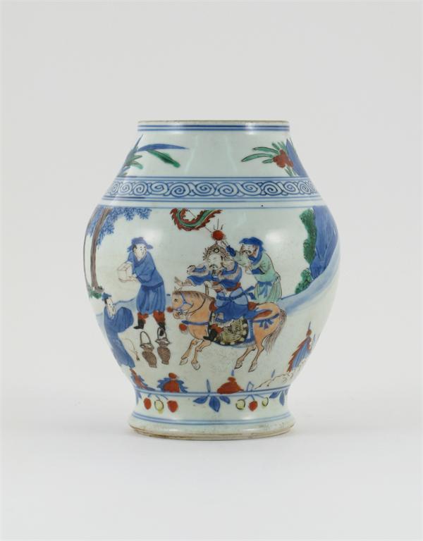 A Chinese small ovoid vase, decorated in underglaze blue and wucai enamels with a scene from a romance, Shunzhi period 1644-1661, a long body crack, 18.5cm.