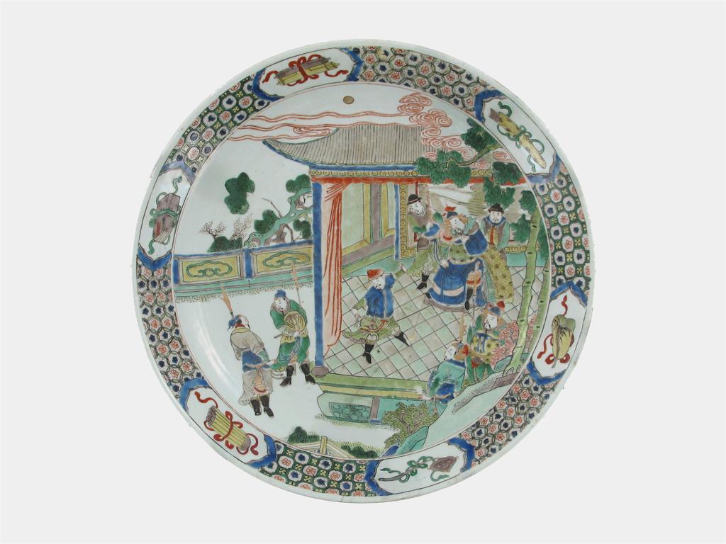 A large Chinese famille verte dish, decorated with a dignitary seated in a pavillion with two attendants and four warriors, the rim with panels of antiques on a diaper ground, the base with a shop mark, Kangxi 1662-1722, extensively damaged and restored, 38.2cm.
