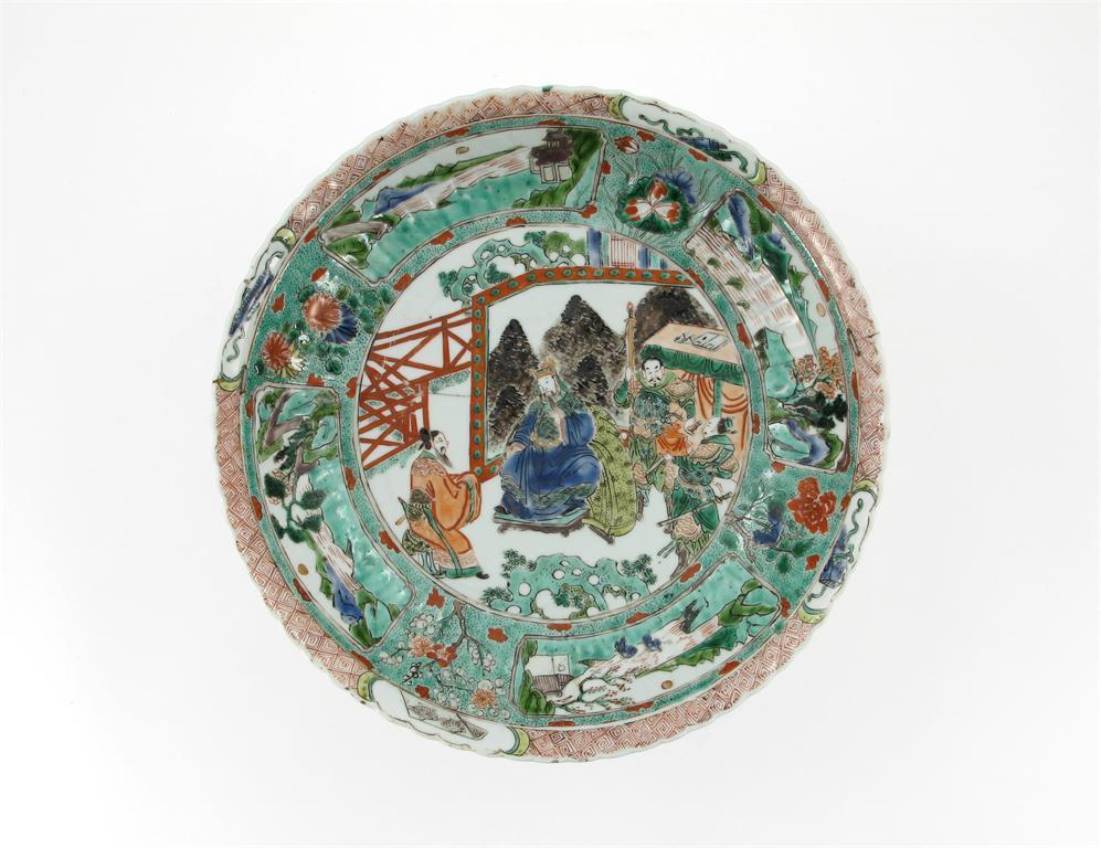 A Chinese famille verte moulded dish, painted with a dignitary seated on a terrace with attendants before a screen, the cavetto with landscape panels of a spotted green ground, an artemesia leaf mark, Kangxi 1662-1722, broken in half and repaired with rivets, 27.5cm.