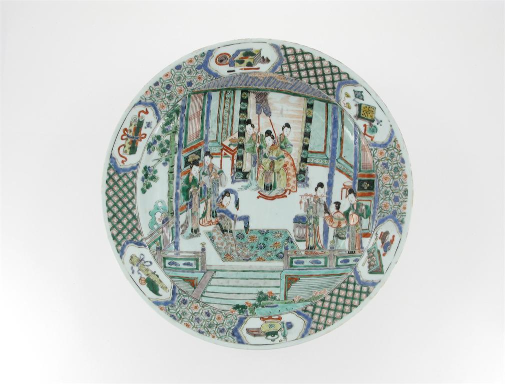 A large Chinese famille verte dish, decorated with a scene from a romance, depicting nine beautiful young ladies, an artemesia leaf mark, Kangxi 1662-1722, extensively damaged and restored, 37cm.