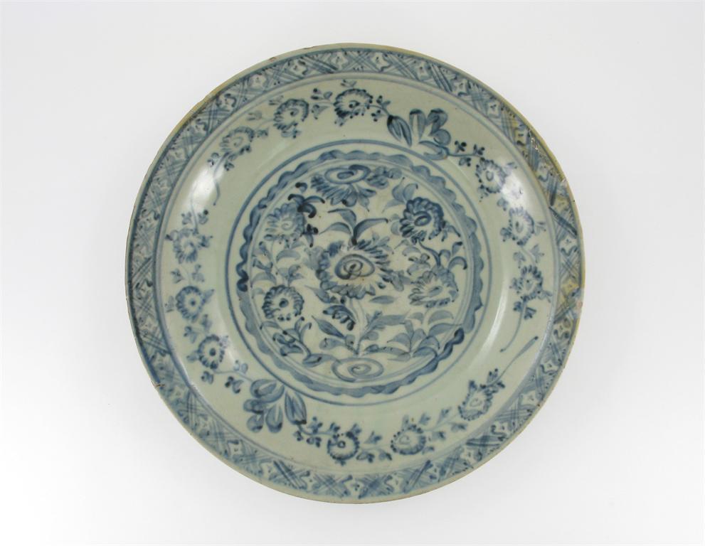 A large Chinese Swatow-type stoneware dish, painted in underglaze blue with a panel of scrolling flowers and with floral sprays to the cavetto, Fujian province late 16th / early 17th century, old restored rim chips, 41cm.