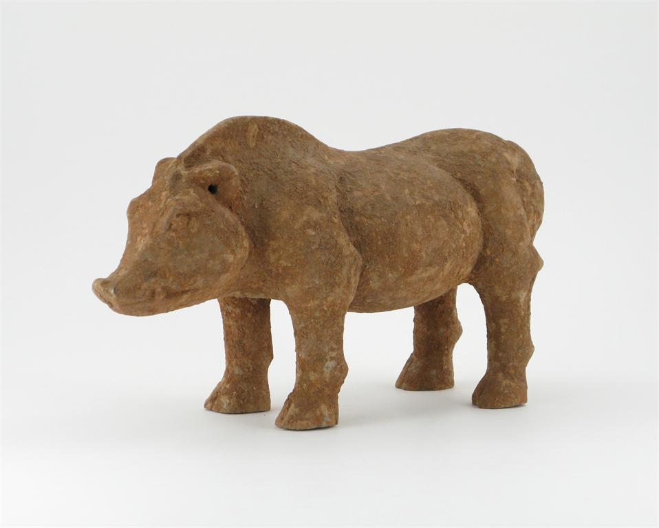 A Chinese pottery model of a standing boar, his head lowered, Sichuan Province, Eastern Han dynasty 25 - 220AD, minor repairs, 37cm. From the collection of Professor D R Laurence MD. Provenance: purchased from R & G McPherson Antiques.