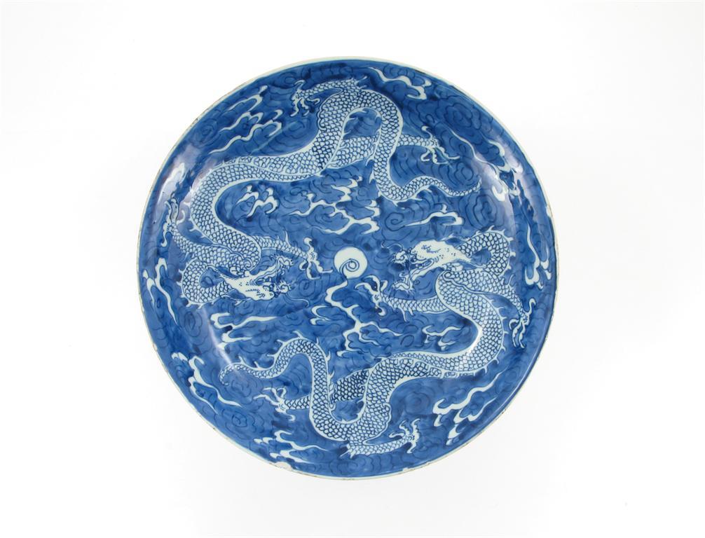 A Chinese blue and white large saucer dish, with a channel footrim, painted with two scaly four-clawed dragons contesting a flaming pearl, all reversed in white on a blue wash ground, the reverse with Buddhist emblems, an artemesia leaf mark, Kangxi 1662-1722, rim chips, 34cm dia.