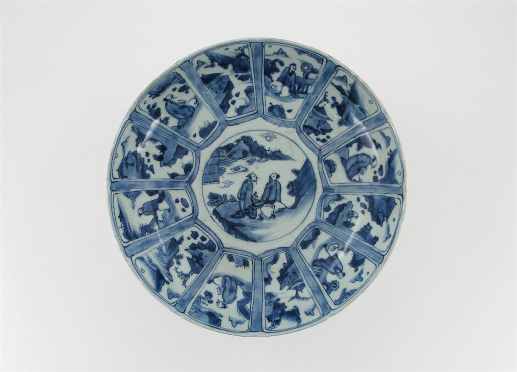 A Chinese blue and white moulded dish, painted in the Kraak style with a central roundel enclosing a scene depicting a scholar and his attendant, the cavetto with twelve panels of landscape scenes, Tianqi period (1622-1627), minor faults, 27cm.