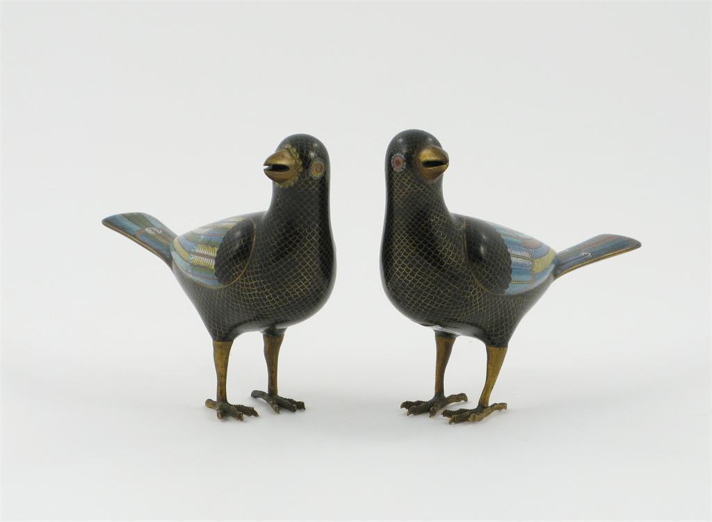 A pair of Chinese cloisonné models of birds, standing with their heads turned to the sides, their flight feather picked out in polychrome against black plumage, 19th century, 19cm. (2)