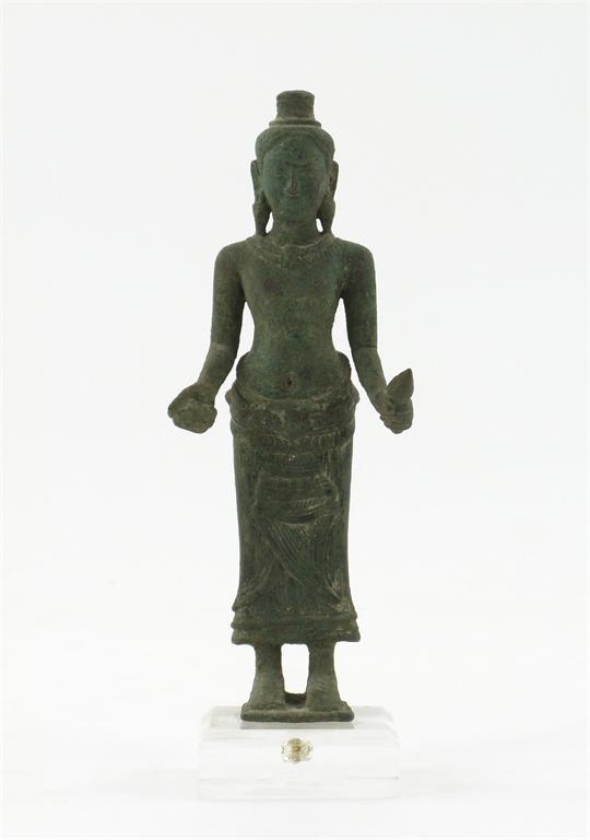 A Khmer Lopburi bronze figure of Avalokitesvara, standing wearing a striated sampot and holding a lotus bud, the surface with a green patination, c.13th century, 23.7cm. Provenance: An English private collection.
