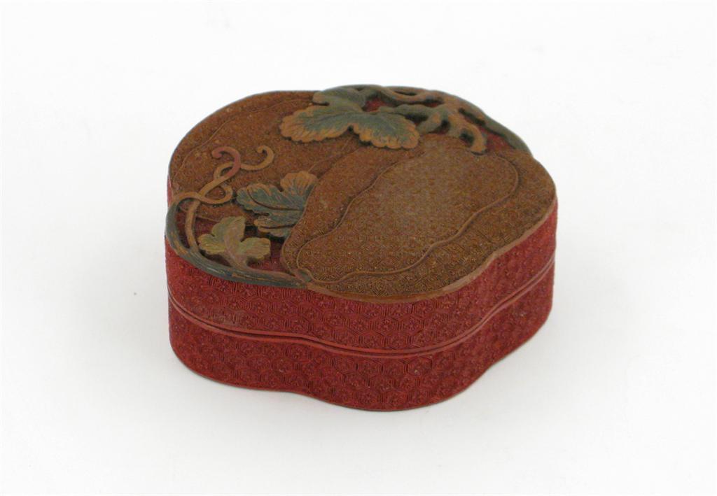 An unusual Chinese red cinnabar lacquer box and cover, the lid decorated in brown and green with two large melons or gourds, issuing from leafy stems, the sides with complex hexagonal diaper designs, 18th century, wear and chips to the flange, 11.8cm. (2)