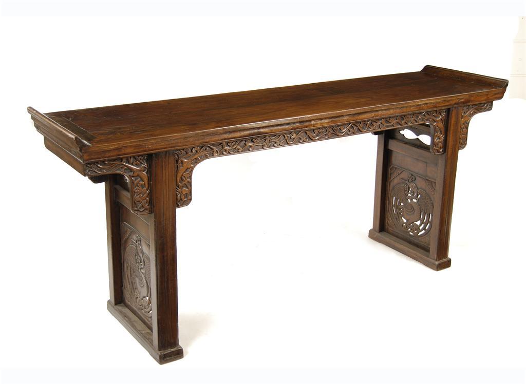 A Chinese nanmu (elm) altar table, with scrolling ends, the frieze carved in relief with stylized dragons and lingzhi, both ends enclosing an openwork candle on an open-winged crane holding a fungus in its beak, Shanxi Province 1850-1900, 207cm long x 90.1cm high x 53cm deep.
